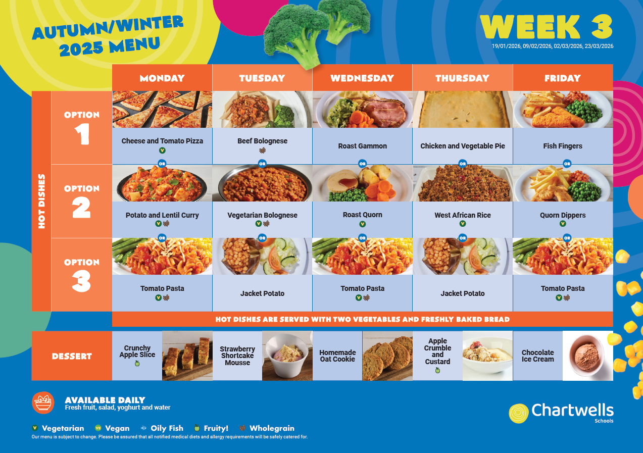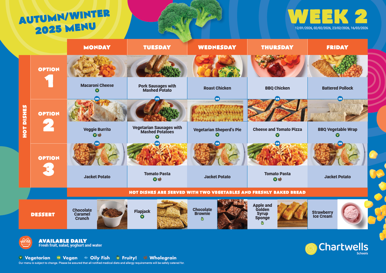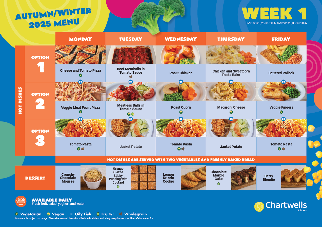Chartwells are our school’s catering team. Chartwells are very experienced and enthusiastic about feeding children well and offering tasty meals from nutritionally balanced menus.